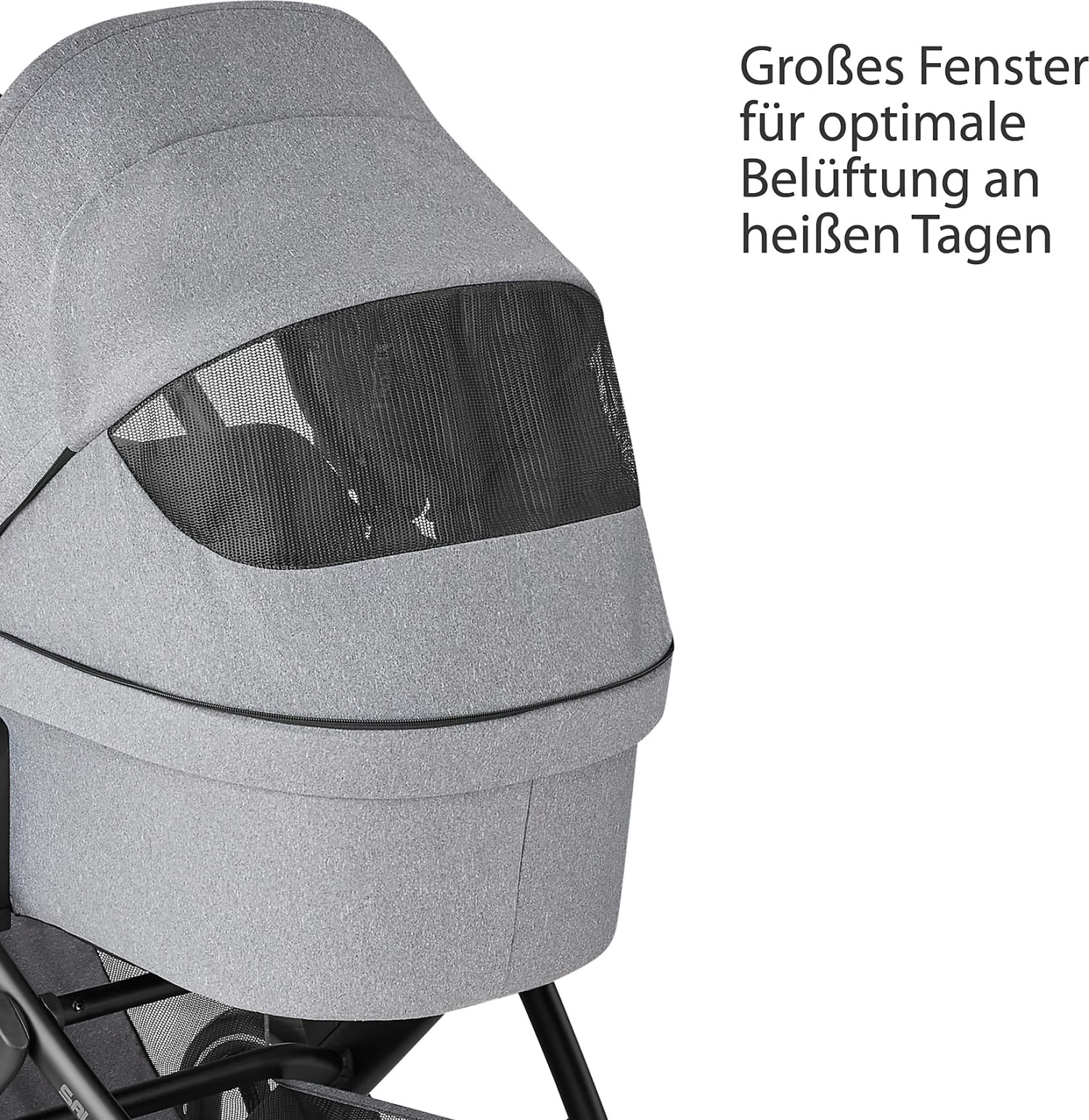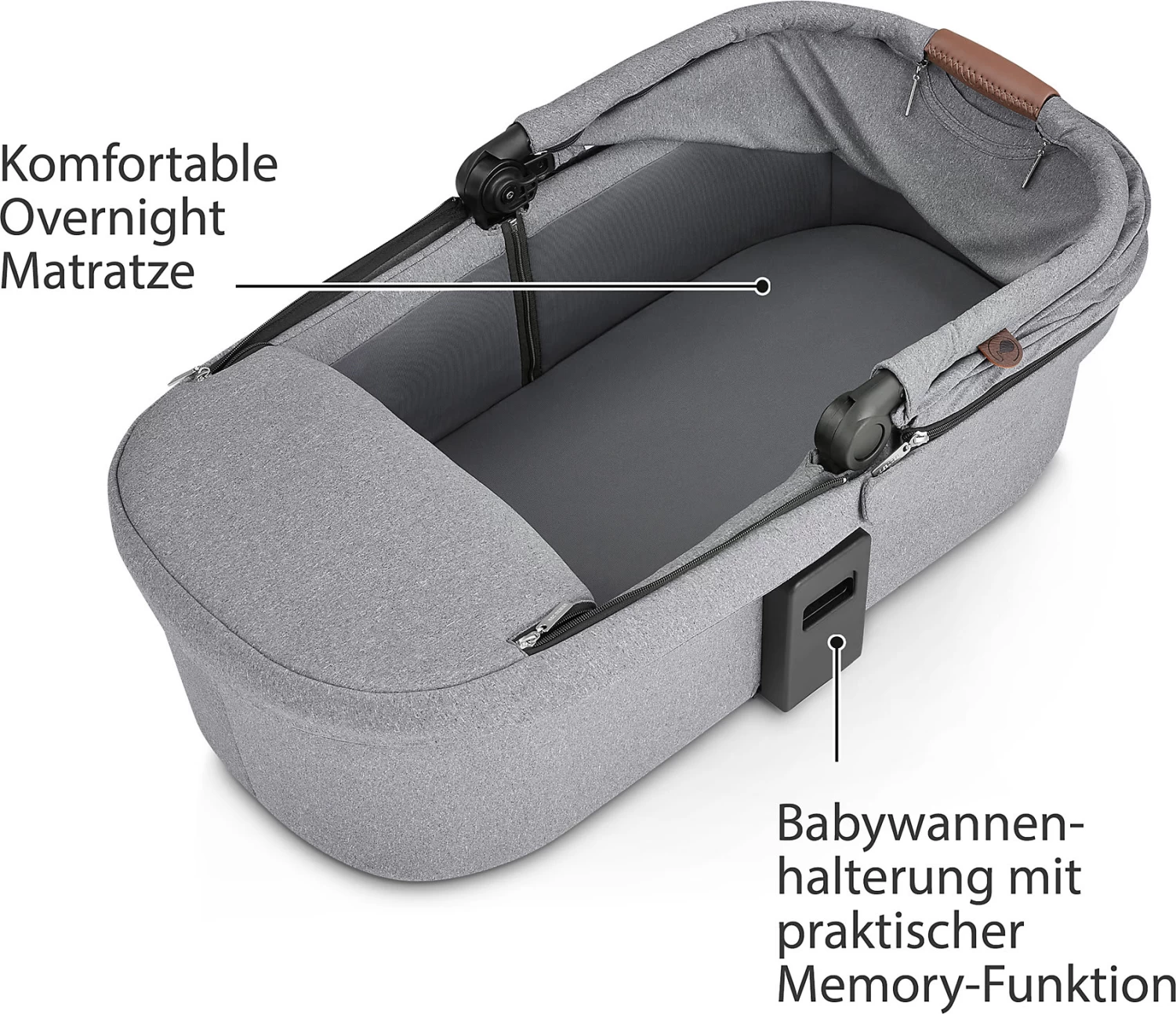 Sowohl die waschbare Fußstütze als auch die Rückenlehne und der Schieber sind in der Höhe verstellbar. Außerdem ist der Kinderwagen mit einem 5-Punkt-Gurtsystem, einem Sonnendach und einem Reißverschluss an der Schutzdecke ausgestattet. Die Sitzeinheit lässt sich umsetzen und die keilförmige Overnight Sleep Matratze sorgt für ein angenehmes Liegen des Kindes. Die faltbare Babywanne punktet mit einer guten Belüftung sowie einer Memory-Funktion für eine perfekte Einstellung. Ein praktisches Zubehörteil ist das Einkaufsnetz, das mit zu 5 kg belastet werden kann.