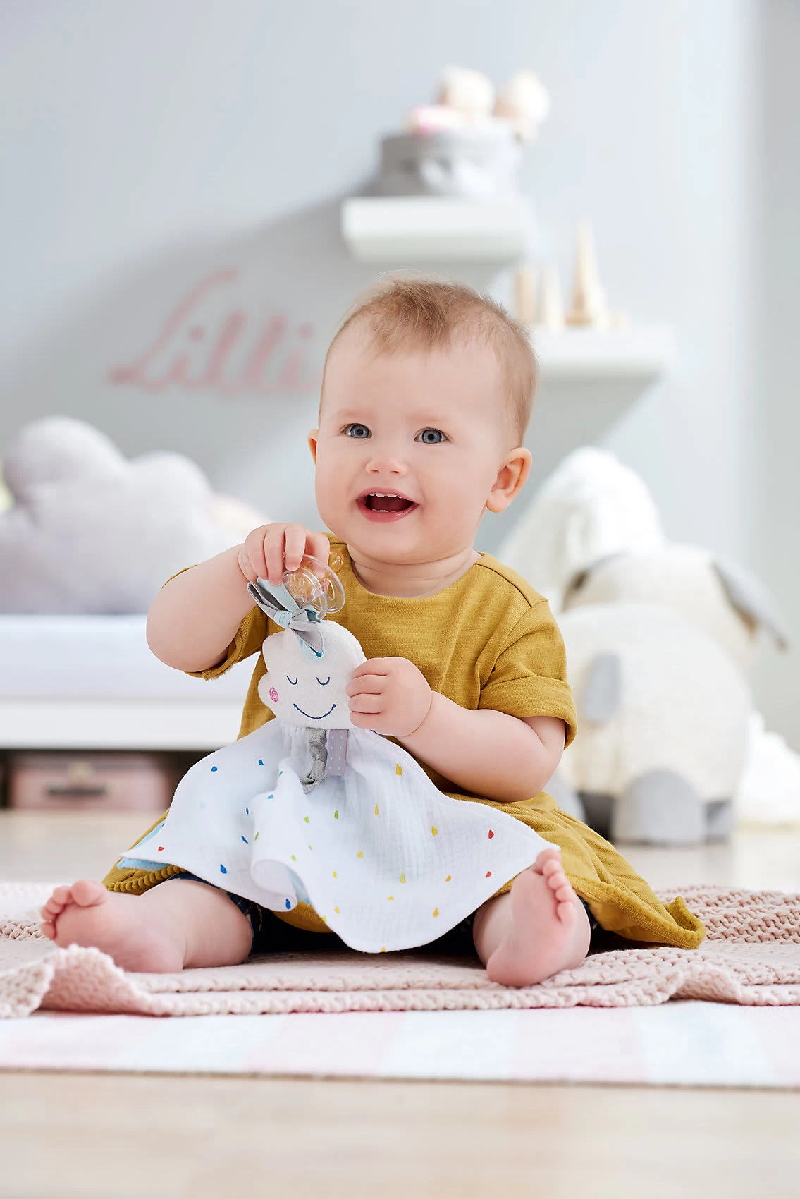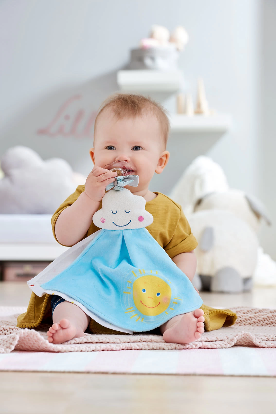 Egal ob Zuhause oder unterwegs – das kuschelweiche Schmusetuch „Traumwolke“ von Haba spendet Ihrem kleinen Liebling stets Geborgenheit und bietet tolle Greif- und Beißmöglichkeiten. Besonders für zahnende Babys eignet es sich deswegen ideal.