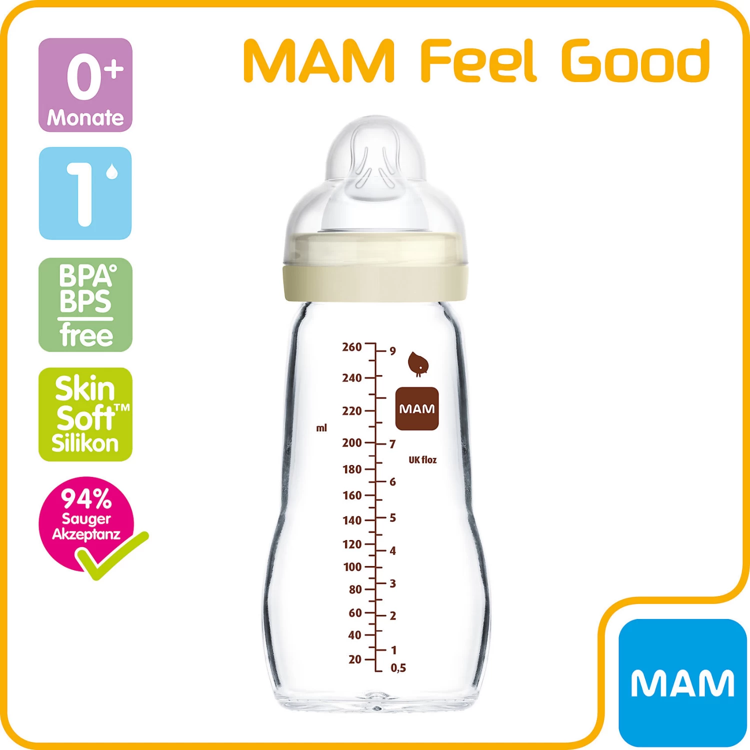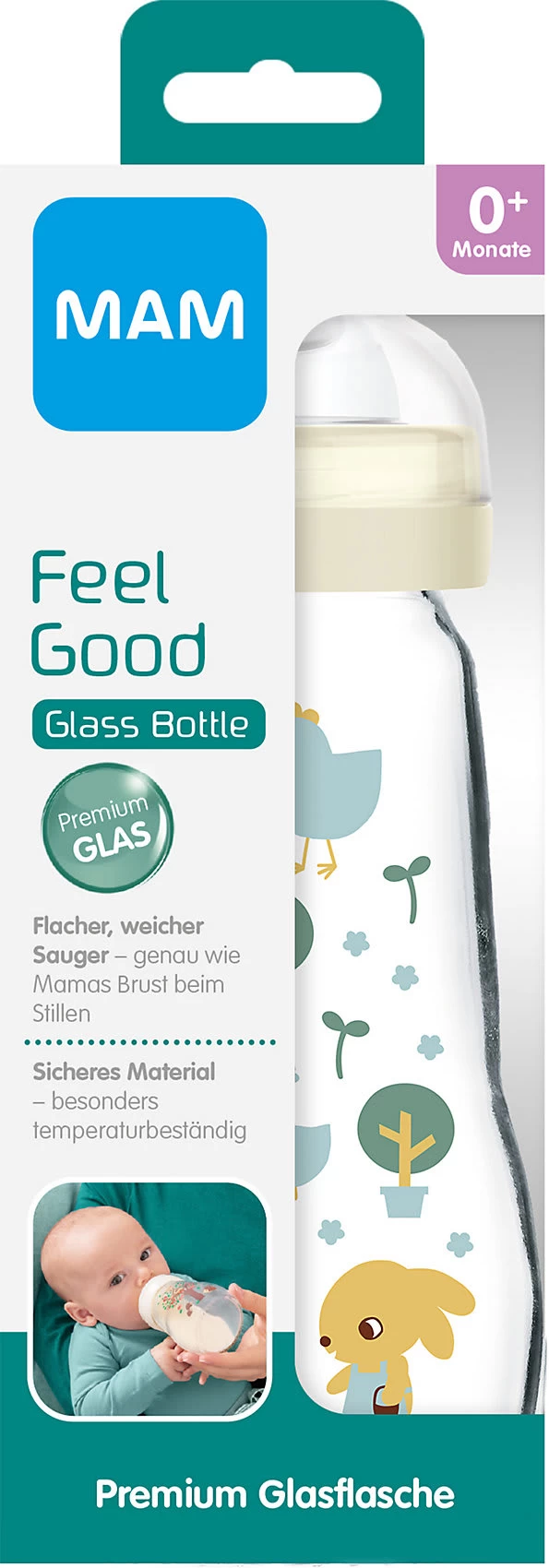 Die Weithalsflasche Feel Good von MAM ist leicht zu befüllen und zu reinigen. Eine Verschlusskappe und ein Dichtplättchen sorgen für eine hygienische Aufbewahrung sowie einen sicheren Transport. Der SkinSoft-Sauger fühlt sich naturnah an und wird von vielen Babys problemlos akzeptiert.