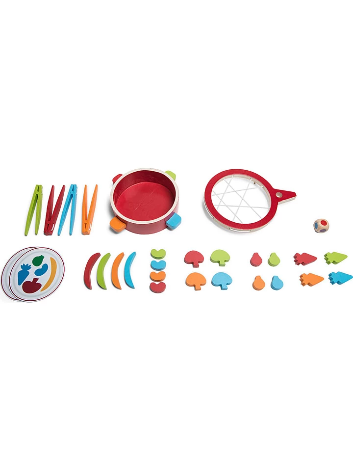 – Inhalt: 1 Topf mit Deckel, 4 Zangen, Spielsteine, 1 Würfel, Vorlagenkarten