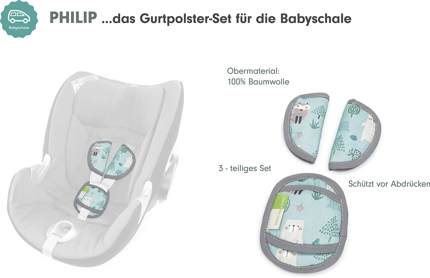 PHILIP, das Gurtpolster-Set von priebes für die Babyschale! Perfekter Begleiter für unterwegs: die Polster von PHILIP passen an die Gurte der meisten handelsüblichen Babyschalen, sehen toll aus und schützen das Baby vor Druckstellen durch den Gurt.