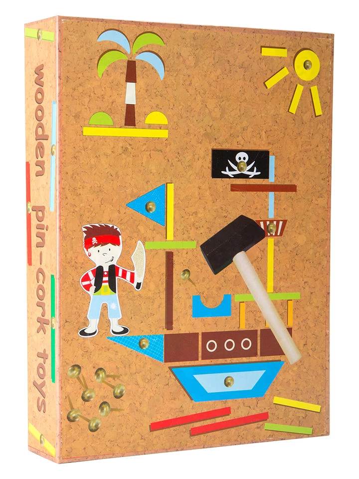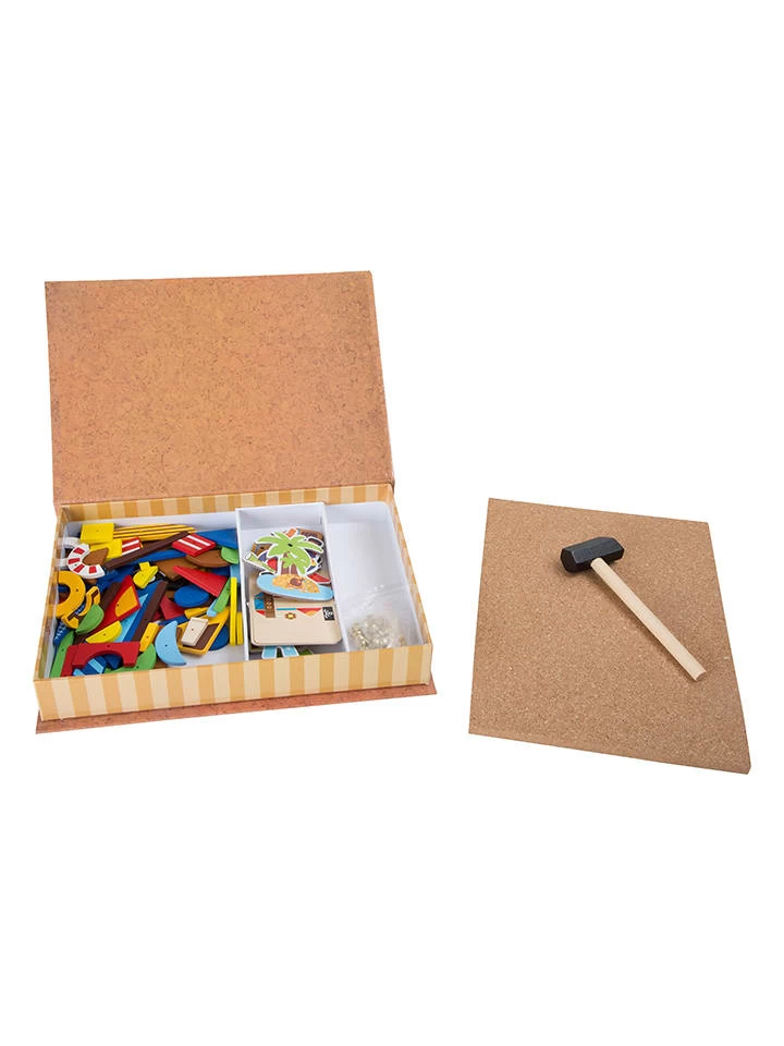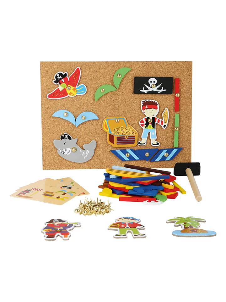 – Inhalt:1 Korkplatte, verschiedene Piratmotive, Nagel, Hammer, 4 Vorlagekarten