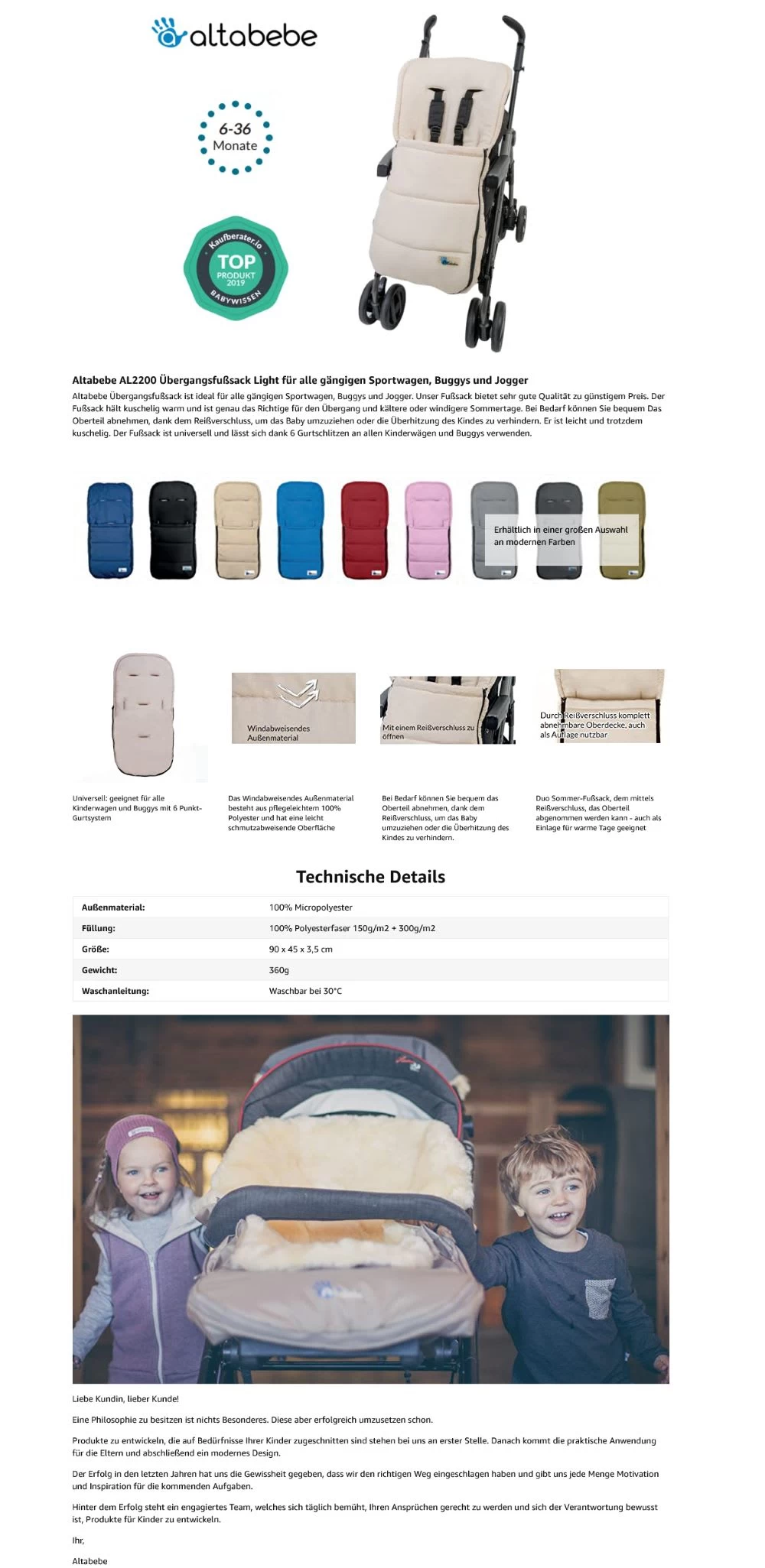 AltaBeBe Sommerfußsack ist ideal für alle gängigen Sportwagen, Buggys und Jogger. Unser Fußsack bietet sehr gute Qualität zu günstigem Preis. Der Fußsack hält kuschelig warm und ist genau das Richtige für den Übergang und kältere oder windigere Sommertage. Bei Bedarf können Sie bequem Das Oberteil abnehmen, dank dem Reißverschluss, um das Baby umzuziehen oder die Überhitzung des Kindes zu verhindern. Er ist leicht und trotzdem kuschelig. Der Fußsack ist universell und lässt sich dank 6 Gurtschlitzen an allen Kinderwägen und Buggys verwenden. 12-36 Monate. Außenmaterial: 100% Micropolyester, Füllung: 100% Polyesterfaser