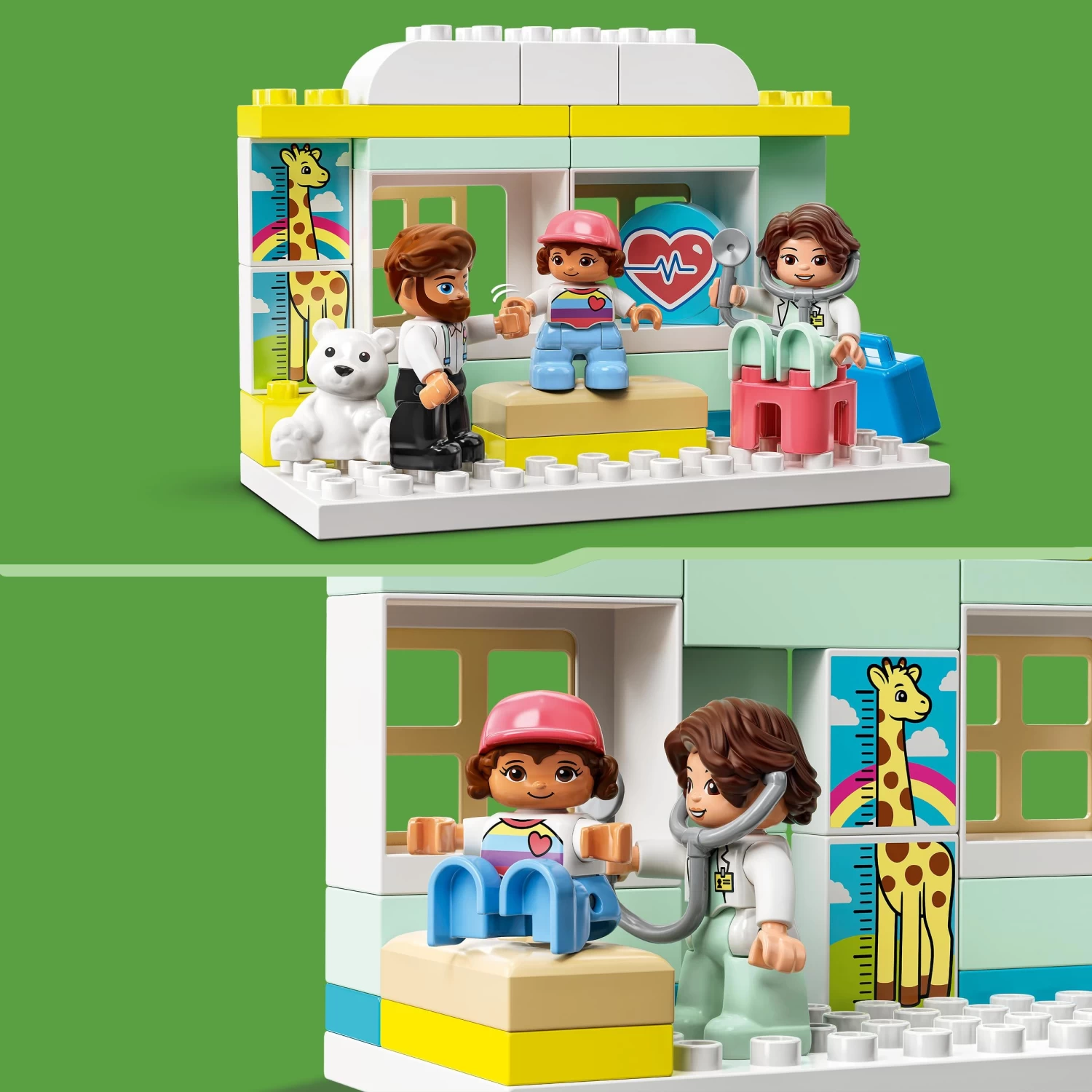 Mit diesem Spielset kannst du deinem Kind zeigen, was bei einem Arztbesuch passiert. Die freundliche Ärztin hört mit ihrem biegsamen Stethoskop das Herz des Kindes ab. An der Wand hängt eine Giraffen-Messlatte, am Waschbecken kann man sich die Hände waschen und der Vater kann sich auf einen der Stühle setzen. Dieses vielseitige Spielset lässt dein Kind soziale und emotionale Fähigkeiten entwickeln und ist eine tolle Vorbereitung auf den nächsten Arztbesuch.Details: Tolles Geschenk für kleine Nachwuchsmediziner: Das LEGO® DUPLO® Spielset Arztbesuch (10968) zeigt deinem Kind die spannenden Aktivitäten in einer Arztpraxis und bereitet es auch wunderbar auf seine nächste Untersuchung vor Faszinierendes Spielset: Beinhaltet 3 LEGO® DUPLO® Figuren – eine Ärztin, einen Vater und ein Kind mit seinem Teddybären – sowie eine Giraffen-Messlatte, ein Waschbecken, ein Sofa, einen aufklappbaren Koffer und 2 Stühle Fantasievolle Rollenspiele: Mit dem biegsamen Stethoskop, das sich nicht abnehmen lässt, kann die Ärztin das Herz des Kindes abhören. Dein Kind kann sich aber auch noch viele weitere Geschichten ausdenken und darstellen Arztpraxis für fürsorgliche Kinder: Dieses Spielset ist perfekt für junge Nachwuchsmediziner ab 2 Jahren und für Eltern, die die wichtigen Entwicklungsschritte ihrer Kinder nicht verpassen möchten Vielseitiges Spielset: Das kleinkindgerechte Modell ist 17 cm hoch, 20 cm breit und 10 cm tief und lässt sich für weitere Spielabenteuer mühelos mit anderen LEGO® DUPLO® Spielzeugen kombinieren Story Starters: Eine spannende Bildergeschichte zu diesem Spielset lässt junge Kinder kreativ bauen und fantasievoll spielen Spielerisches Lernen: Alle LEGO® DUPLO® Sets sind mit verschiedensten Figuren und faszinierenden Details so konzipiert, dass dein Kind spannende Geschichten darstellen kann und einen TOLLEN Start ins Leben hat Beständige Qualität: LEGO® DUPLO® Elemente erfüllen bereits seit 1969 strenge Branchenstandards, damit kleine Finger die Teile leicht greifen, platzieren und wieder trennen können Garantiert sicher: LEGO® DUPLO® Steine und Teile werden Fall-, Hitze-, Druck- und Torsionstests unterzogen und analysiert, damit sie strenge globale Sicherheitsstandards erfüllen